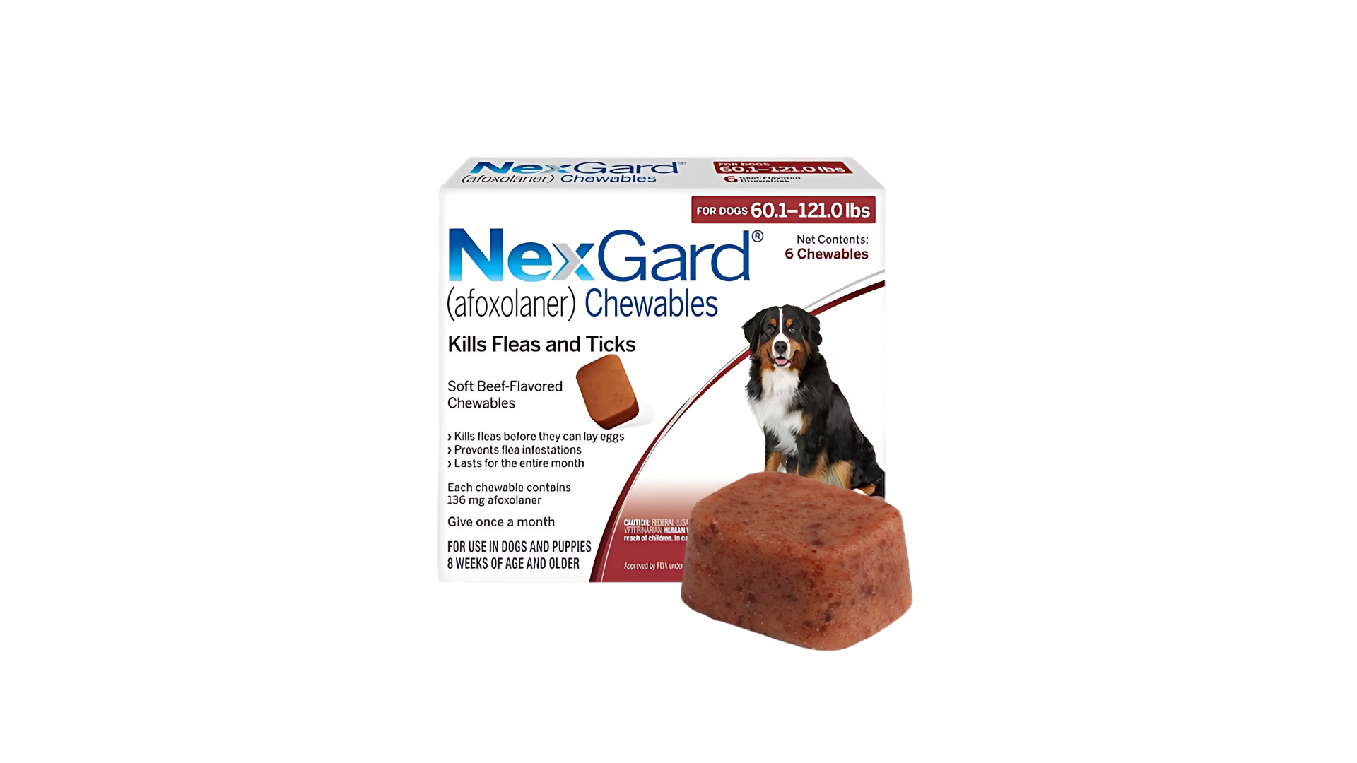 NexGard is a tasty chewable tablet for dogs which kills fleas and ticks by over-stimulating their nervous system. The active ingredient in NexGard is afoxolaner. The afoxolaner is absorbed into the bloodstream after taking the chewable tablet. Fleas and ticks attach to your dog and begin to feed. As a result they are exposed to the active ingredient and the effect occurs within 8 hours (fleas) to 48 hours (ticks). The effect against fleas will last 5 weeks, and the effect against ticks lasts 4 weeks.